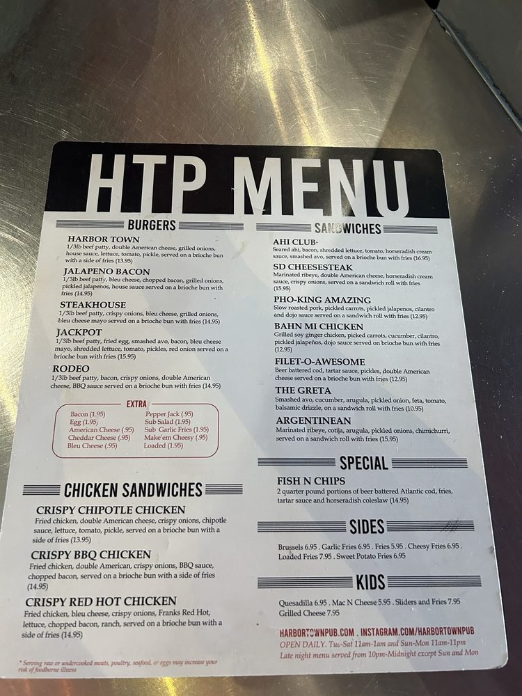 Harbor Town Pub in San Diego offers a diverse menu with New American cuisine in a casual and vibrant setting. The pub provides a range of amenities including takeout, delivery, vegan and vegetarian options, outdoor seating, and happy hour specials. You can enjoy mouthwatering appetizers like Ahi Poke Tostada and Bahn Mi Sliders, or indulge in their flavorful burgers such as the Harbor Town and Jackpot. The pub also offers extras like bacon and cheese additions to customize your meal. With its welcoming atmosphere and a variety of services like catering and private dining, Harbor Town Pub is a great spot for groups, families, and even four-legged companions. Don't miss out on experiencing the delicious food and lively ambiance at this popular hotspot in San Diego!